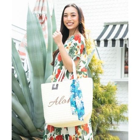 [型番:42LP5201-2025]ざっくりとしたペーパー素材に、持ち手へ結んだハワイアン柄スカーフが映えるトートバッグ。フロントの上品なALOHAの刺しゅうがリゾートムードを高めます。マチ付きで見た目以上の収納力があり、小物を整理できる内ポケット付き。軽やかで持ちやすく、デイリーにもおでかけにもおすすめです。