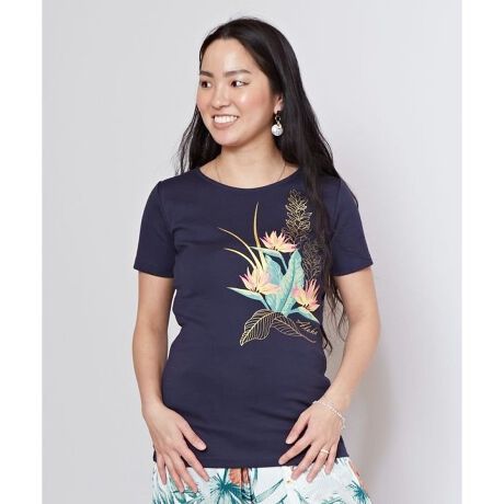 [型番:4CA-5215-2025]華やかなハワイの花のブーケ風デザインのフラTシャツ。着心地が良く、着丈も長めでフラのレッスン着としても活躍します。