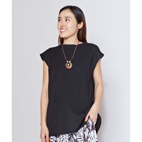 [型番:4CA-5227-2025]プリーツカットソー生地のトップス。斜めにカットされた背面と、襟もとのゴールドのAlohaのチャームがポイント。パンツとのセットアップ着用もおすすめ。