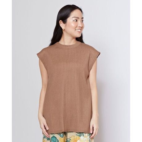 [型番:4CA-5227-2025]プリーツカットソー生地のトップス。斜めにカットされた背面と、襟もとのゴールドのAlohaのチャームがポイント。パンツとのセットアップ着用もおすすめ。