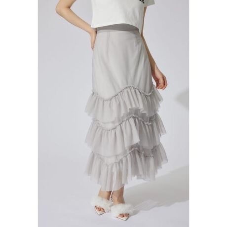 【チュールの3段ティアードデザインが女性らしいセミフレアスカート】■ポイントティアードのフリルの所だけチュールを重ねてギャザーをたっぷり寄せて華やかなスカートに。また真横の切り替えティアードではなく、カーヴィングを付けてより立体感と動きを出したのがポイントです。■ディテール裾のティアードがボリュームがあるので、ウエストや腰回りはスッキリして見えるようタイトなシルエットに仕上げました。着用した時に三角形のフォルムになるのでスタイルが良くみえます。またウエストの後ろには平ゴムが施されているので楽に着られるのも嬉しいポイント。■スタイリングショート丈から長めの着丈のTシャツまで簡単にスタイリングが可能です。またトップスをタイトのニットアイテムにすると綺麗めなコーデの完成です。■生地透け感:なし裏 地:あり伸縮性:なし光沢感:なし厚 さ:なし■商品のお気に入り登録お気に入りアイテムの再入荷・在庫1点などの通知を受け取ることができます。[注意事項]※画像の商品はサンプルです。実際の商品と仕様、加工が若干異なる場合があります。※画像の商品は光の照射や角度、お使いのモニター環境により、実物と色味が異なる場合がございます。※着用、お取り扱いの際は、アテンションタグをご確認ください。