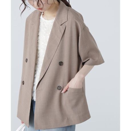 夏のプラスワンアイテムとして活躍できるオーバーサイズの半袖ダブルブレストジャケット。ドライタッチでシャツ生地程度の薄手でありながらも、きちんと感のある麻調合繊生地を使用しています。シワになりづらくケアもラクにできるため、ONにもOFFスタイルにもおすすめ。シンプルなキャミワンピース合わせでレディにも、プリントTシャツ×デニムやティアードスカート合わせでカジュアルにも幅広いスタイリングを楽しめます。※モデルの着用画像の場合、光の当たり具合により、実際の色味と異なって見えることがございます。色味は、商品単体の画像をご参照ください。