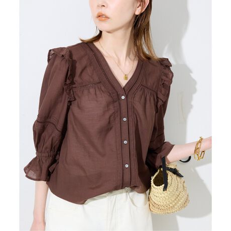 フリルデザインを大人に着こなせるようなVネック開きのコットン混ブラウス!