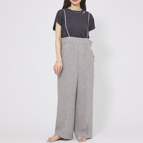 腰で止まらないゆったりサイズをサスペンダーでサロペットのように着るタイプのパンツ。このデザインならではのウエスト周りの直線美が抜群のスタイルアップ&体型カバーを叶えます!サスペンダーはアジャスター付きで、全体の長さ調節が可能です。センタープレス入りなのでラフにならず、高見えカジュアルに仕上がります。