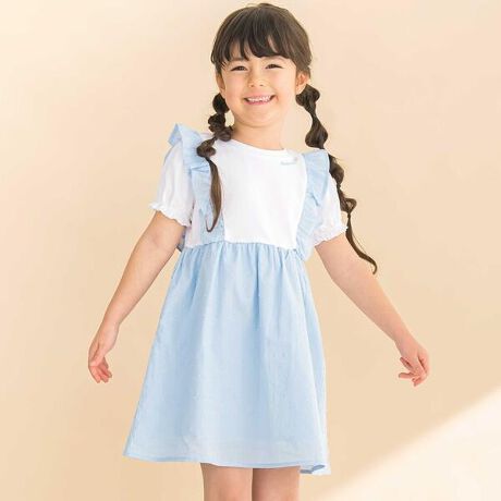 スカートや肩フリルは手触りがよく光沢感のあるドビー生地を使用して上品な仕上がりに。