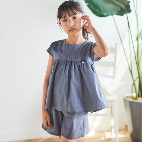 半袖の切替ブラウスとショートパンツの女の子用セットアップ。
