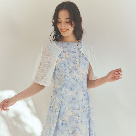 全面に繊細なアイレット柄の透かし編みを丁寧に編み上げたことで、軽やかな着心地と上品な甘さを感じるショート丈のボレロに仕上げました。