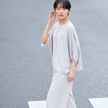 [型番:U1M16566__]【ウォッシャブル】【接触冷感】【UV】バックサテンジョーゼットプルオーバーブラウス風通しが良く、着心地抜群のブラウスです。分量感のあるドルマンスリーブが特徴です。二の腕をしっかりカバーし、ゆったりとしたシルエットなので暑い日にも最適です。UVカット・接触冷感効果のある機能糸「SPF」を使用した、しなやかなドレープ性のある2WAYストレッチ素材です。【着用推奨シーズン】春〜秋