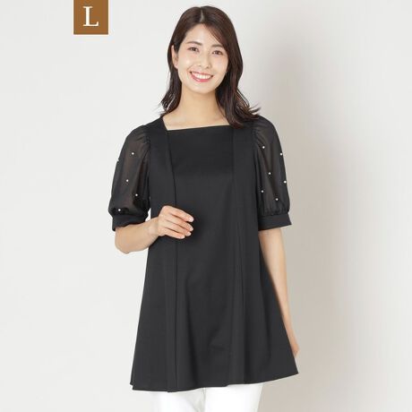 袖に繊細な別布を重ね、パールビジューをドットのように上品に散りばめることで、華やかさの中にも洗練された輝きをプラス。袖口にはカフスをあしらい、優雅な雰囲気に仕上げたエレガントなトップスです。