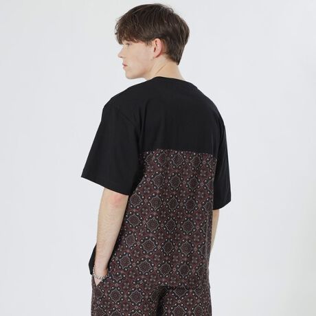オリジナルで作成したオーナメント柄の布帛生地と無地のカットソー素材を大胆にブロッキングしたデザインです。