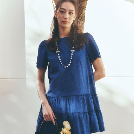 全体を縦長のすっきりとしたシルエットに仕上げ、裾には二段のティアードデザインを施すことで華やかなアクセントを添えました。
