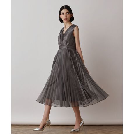 柔らかくてしなやかなシアー素材お作りしたシンプルなカシュクールドレス。光沢感のある糸を使い、細かいメッシュ編みにしてハリを持たせたブライトメッシュ素材を使用。タックを入れながらドレープを出したカシュクール仕立ての胸元と、ウエストは切り替えて適度に絞り綺麗なXラインを表現しました。裾はプリーツを全体にかけて,、歩いた時の華やかで美しい揺らぎを感じられるデザインに。シックなブラックと、シルバーグレーのようなニュアンスカラーの2色をご用意しました。