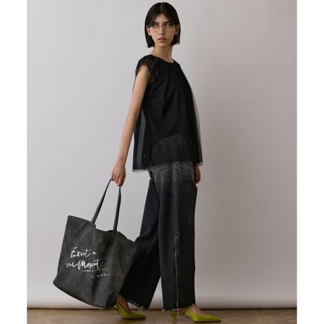 Diagramのために描き下ろした、ヨシダエリさんのテキストアートをプリントしたトートバッグ。表面に軽いクラッシュ感のあるヴィンテージのような風合いのフェイクレザー素材を使用。ハードすぎず女性らしさもある、Diagram らしいビッグトートに仕上がりました。とても軽くて柔らかな素材で、裏地も柔らかいなものを選んでいる為、持ちやすくくたっとした表情がスタイリングにこなれ感を演出。ベージュにはブラック、ブラウンとチャコールにはホワイトのプリントをのせました。 実用性と汎用性を兼ね備えた、トレンド感溢れるゆったりとしたトートバッグ。ざっくりと肩に掛けるラフなスタイルで、今年らしい装いをぜひお楽しみください。
