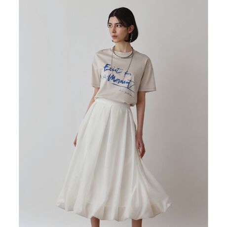 Diagramのために描き下ろした、ヨシダエリさんのテキストアートをプリントした T シャツ。表面が美しいジャパンメイドの綿100%カットソーを使用し、ラフすぎない大人の上質感を感じることができる一枚に仕上げました。型崩れしにくく肌触りも心地よい為、夏の汗ばむ季節にも着やすいのも魅力です。 オーバーサイズのシルエットを表現する為、オフショルダーのボディで作りながらも、女性の身体が美しく見えるように身幅を大きすぎないよう微調整。小柄な方もバラス良く着こなせ、パンツスタイルだけでなくフレアスカートにイン&ブラウジングしたりと女性らしいスタイリングも楽しめる一着です。