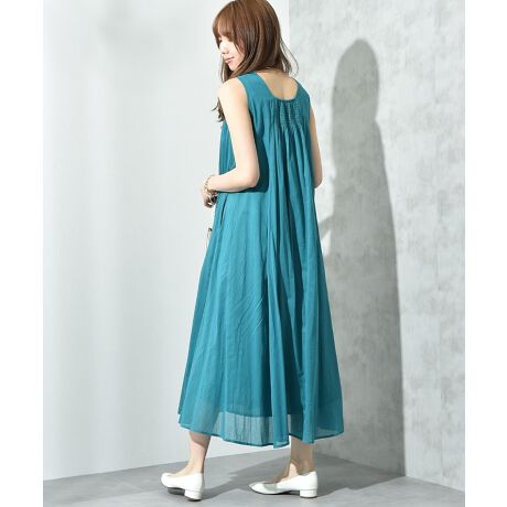 ナチュラルなシボ感で涼し気な素材を使用しています。インド綿は繊維が細くて柔らかい為、肌に優しく心地よい肌さわりが特徴です。通気性の良く蒸れにくいのも◎裾にかけて程よく広がるフレアシルエットがスタイルアップ効果抜群!動くたびに揺れるフレアーが大人レディなアクセントに。前後着用可能の上品なネックはデコルテをきれいに見せてくれ、カジュアルな素材感ながら女性らしい印象に演出してくれるお勧めなワンピースです。