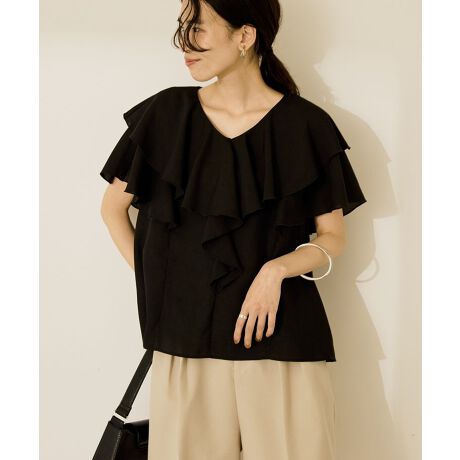 フリルディテールがフェミニンなムード溢れるデザインブラウス。ほんのり丸みを持たせたVネックが顔周りに女性らしい抜け感を演出してくれます。シワになりにくいイージーケア素材なのも嬉しいポイント。シンプルなボトムに合わせるだけでスタイリングを華やかにしてくれるおすすめのアイテムです。透け感[あり]