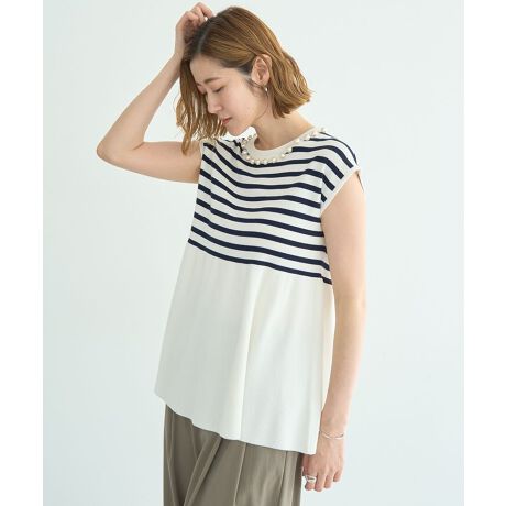 ネックレスのような大きめパールパーツがエレガントなサマーニットプルオーバー。