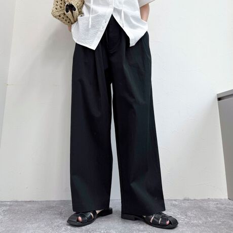 ・ややハリのある素材と脚のラインを拾わないシルエットでスタイルアップを叶えてくれます
