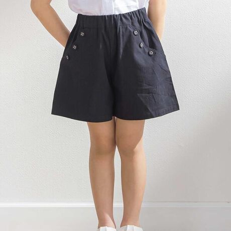 ポケット口のスカラップと共布のくるみボタンがポイントのキュロットパンツ。