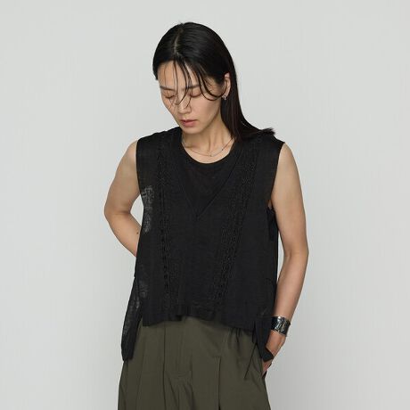 ラメがきらめくレース柄をストライプ状に組み入れた、シアー感が魅力のニットベストです。