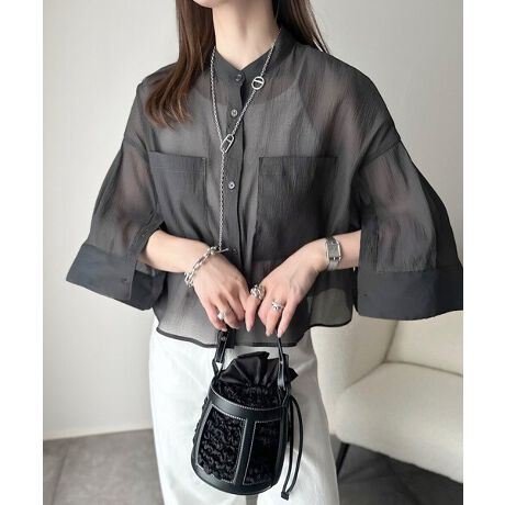 ワイドスリーブがこなれ感を演出する、冷房対策にも抜群のシアーシャツ。