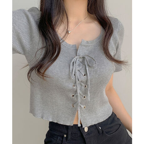 レースアップクロップド丈半袖サマーニットトップス