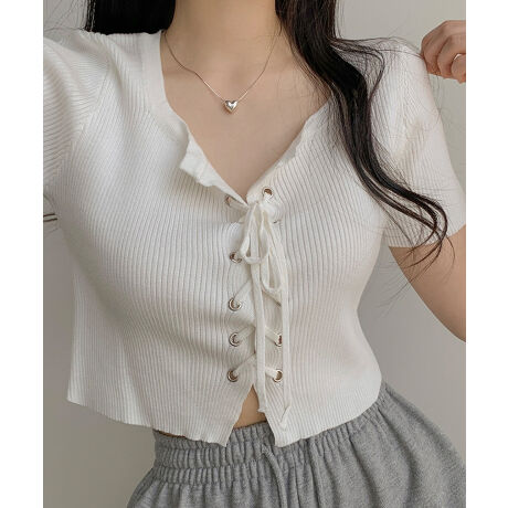 レースアップクロップド丈半袖サマーニットトップス
