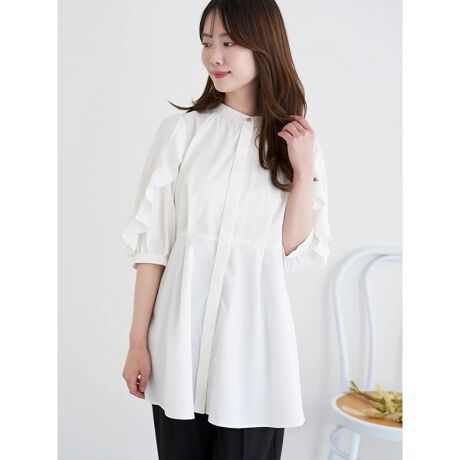 袖のラッフルフリルとフレアシルエットがフェミニンなムードを纏うチュニック。