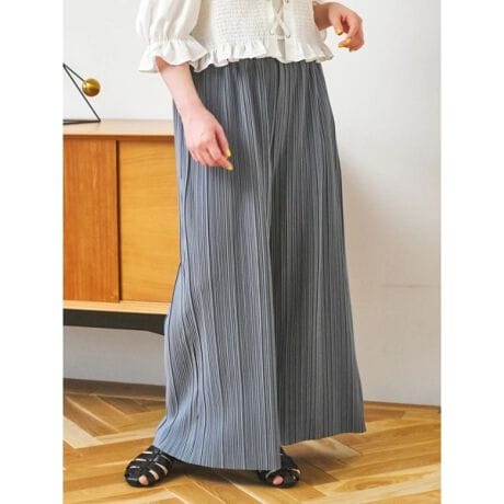 細やかなプリーツ素材の楽ちんキレイ見えパンツ。