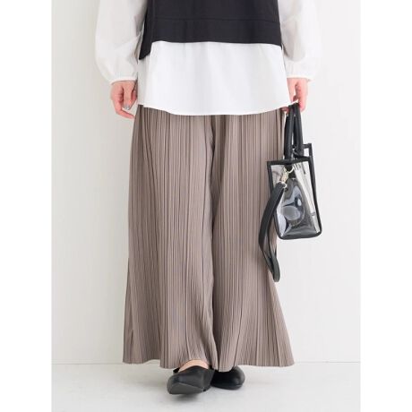 細やかなプリーツ素材の楽ちんキレイ見えパンツ。