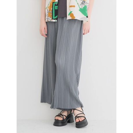 細やかなプリーツ素材の楽ちんキレイ見えパンツ。
