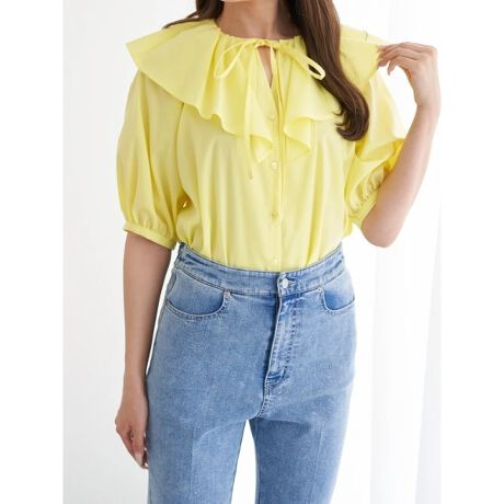 ケープ風の大きなフリル襟とリボンが可愛いフェミニンブラウス。