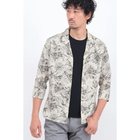細線で描かれたフラワーパターンが、上品で洗練された雰囲気を演出する7分袖のプリントシャツ。