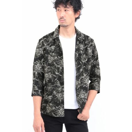 細線で描かれたフラワーパターンが、上品で洗練された雰囲気を演出する7分袖のプリントシャツ。