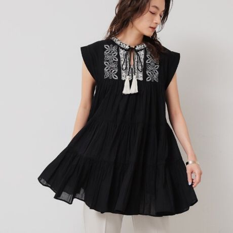 衿元に施した配色の刺繍と、エキゾチックな紐先のタッセルがポイントのティアードブラウス。