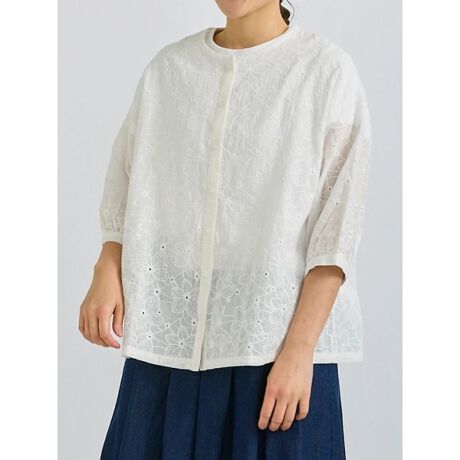 [型番:25410665523]花模様の刺しゅうレースが上品な愛らしさを演出するブラウス。ふっくらと柔らかなフォルムのスリーブも、フェミニンな表情をプラス。シンプルに着るのはもちろん、前を開けてラフに羽織ったりと様々な着こなしのアレンジも楽しめる1着です。Hare no hi/ハレノヒ