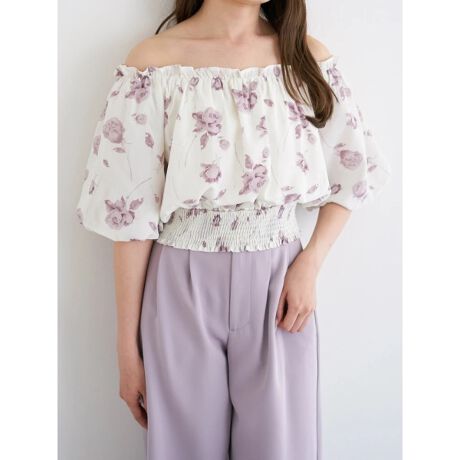 ロマンティックな花柄プリントをあしらった後ろリボンアクセントブラウス。