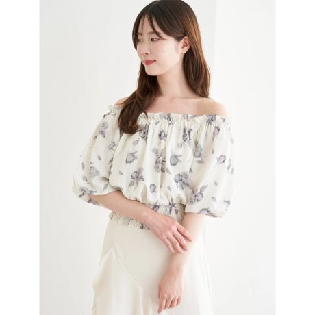 ロマンティックな花柄プリントをあしらった後ろリボンアクセントブラウス。