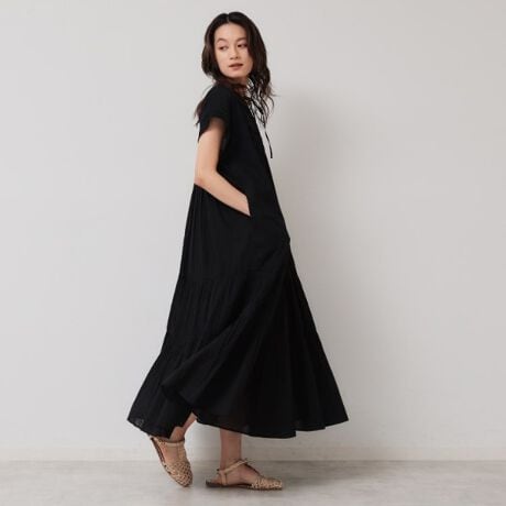 ティアードの切り替えにギャザーフレアを入れ、動くたびに表情が叶うマキシワンピース。
