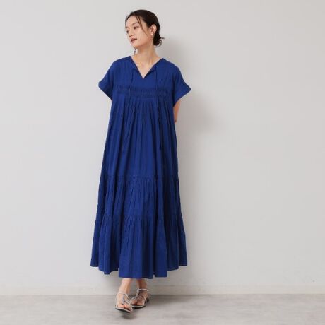 ティアードの切り替えにギャザーフレアを入れ、動くたびに表情が叶うマキシワンピース。