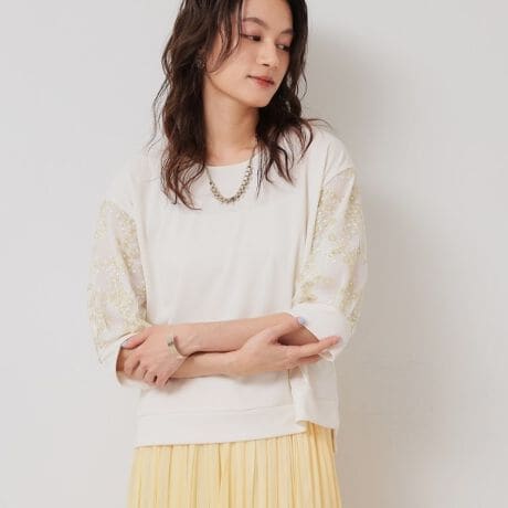 袖部分がシアーなチュール刺繍になっているので程よく透けて抜け感があります。