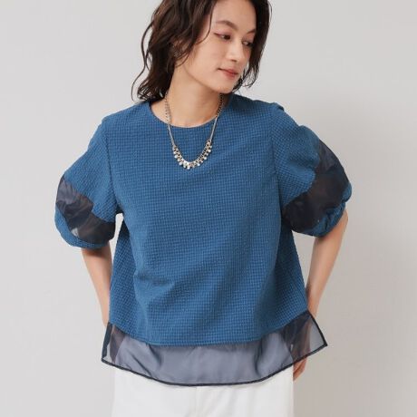 本体はサッカー地を、袖と裾にオーガンジーを使用したTブラウス。