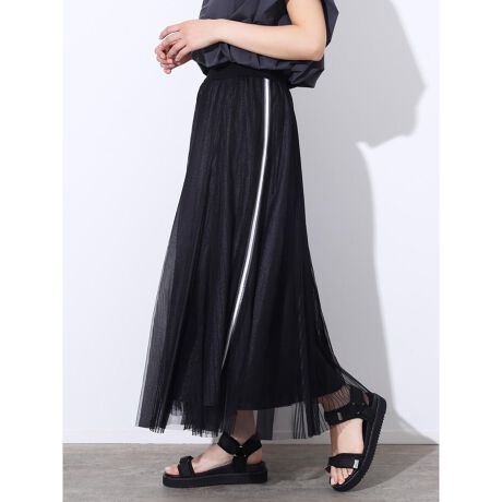 トレンド感たっぷりのチュール素材に、マルチストライプ柄を掛け合わせたフレアスカート。