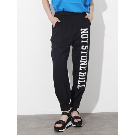 左脚の大胆なロゴプリントが目を惹く、スウェットパンツ。