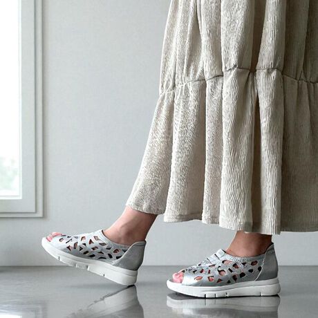 スタイリッシュなカットワークデザインが特徴のオープントゥシューズ。