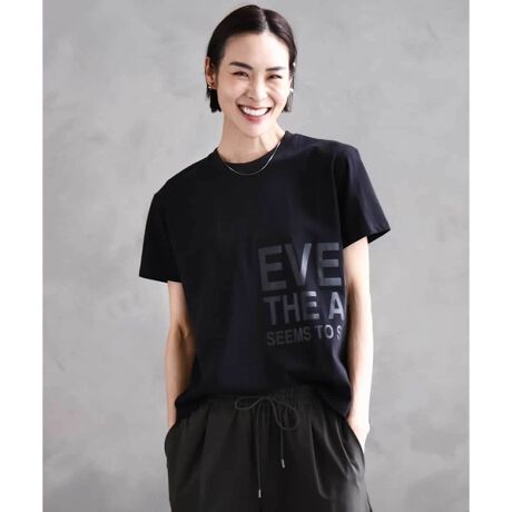 脇に入れた同色のロゴプリントがアクセントの、程よいゆとり感があるベーシックタイプのTシャツです。プリントにはほんのりとラメを混ぜており、ほのかにきらめきくのがさりげないオシャレポイント。メッセージは英語で”空気さえも微笑んでいるようだ”という意味です。