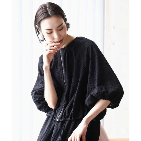総レースの豪華さが目を引く、ボリュームスリーブのブルゾン。涼しく着られるメッシュ素材を裏地に使用することで立体シルエットをキープしていて、デザイン性と機能性を兼ね備えています。裾にはドロストコードを入れることでシルエットの変化が楽しめるデザインに。