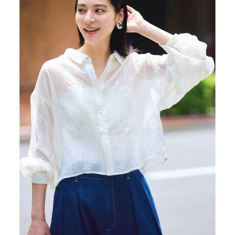 ・程よい光沢のあるシアー素材に、立体感のあるフラワー刺繍を施したが華やかなシアーシャツ。