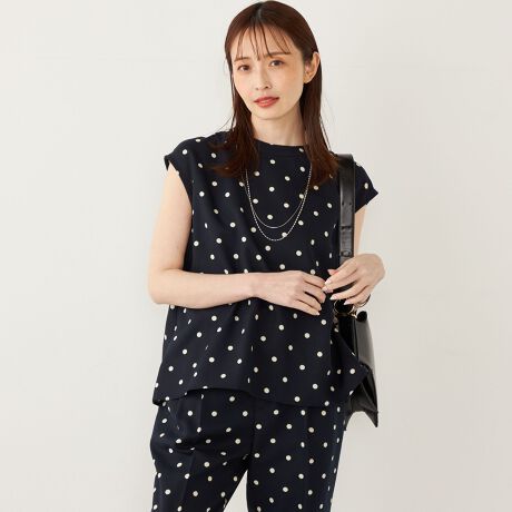 ドット柄がレトロな雰囲気のフレンチスリーブブラウス。