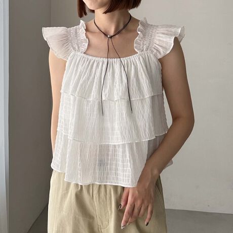 肩のフリルは気になる肩幅をカバーしてくれるので腕を出すのが苦手な方にもおすすめ。
